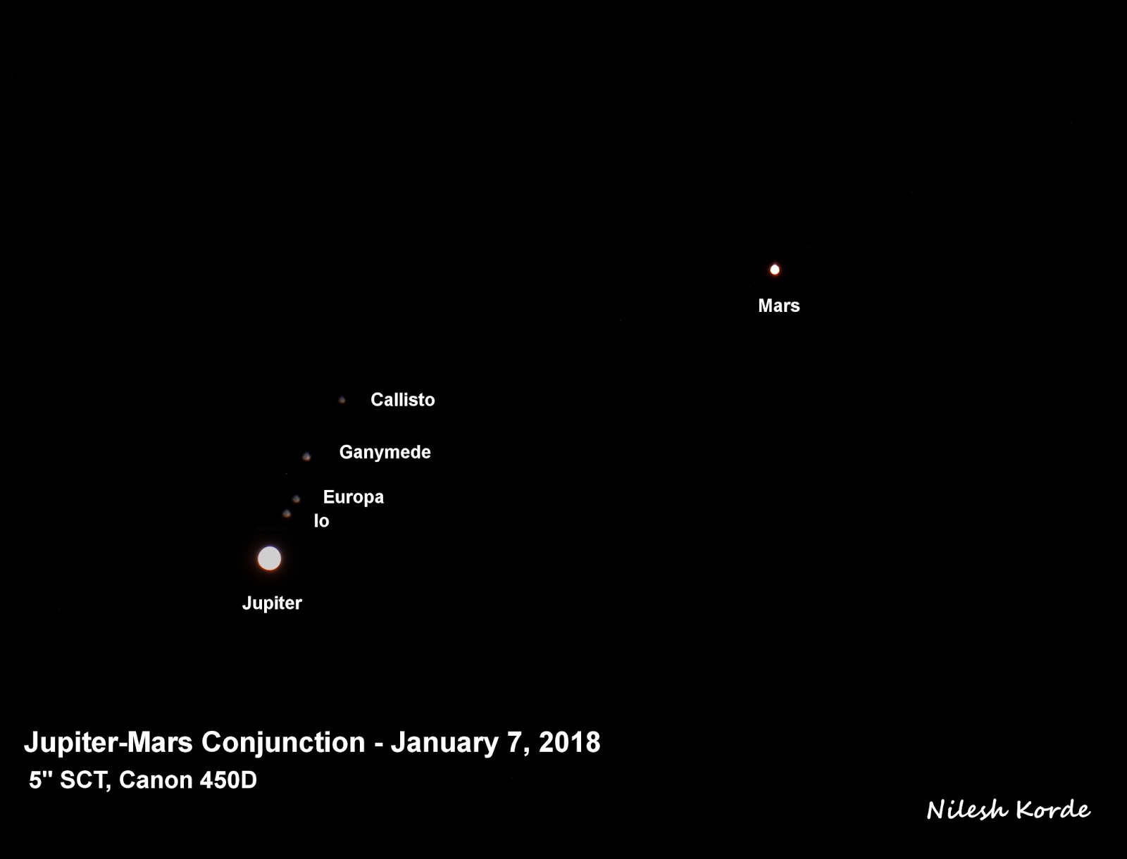 फोटोत गुरूचे चार मोठे चंद्रही स्पष्ट दिसत आहे. मंगळापेक्षा गुरू सध्या जवळजवळ वीसपट प्रकाशमान आहे. गुरूचे चंद्र मंगळापेक्षाही कमी प्रकाशमान आहेत.
