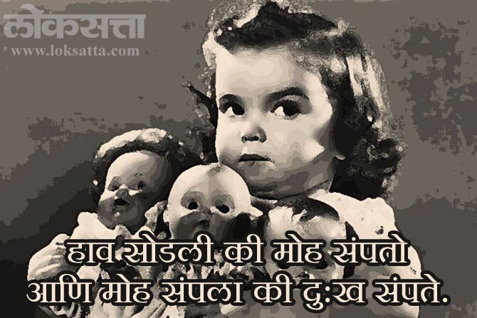 असे सुविचार द्यावेत का, हा सुविचार चांगला आहे का, सोबतचा फोटो चांगला आहे का वगैरे मूल्यमापनात शिरण्याची गरज नाही, पण फोटो आणि सुविचारातली संगती उघड आहे - सुविचार 'हाव' ह्या गोष्टीबद्दल आहे. फोटोतल्या मुलीला बाहुल्यांची हाव आहे म्हणून ती एकाच वेळी तीन-तीन बाहुल्या कवटाळून आहे आणि आपल्या आविर्भावातून सुचवते आहे की 'माझ्यापासून ह्या हिसकावून घेण्याचा विचारसुद्धा करू नका'.