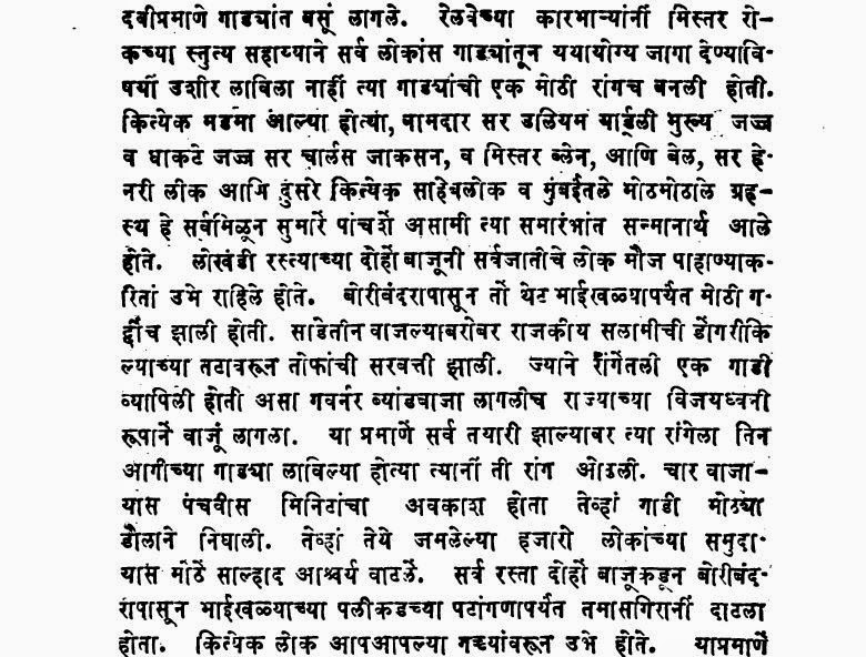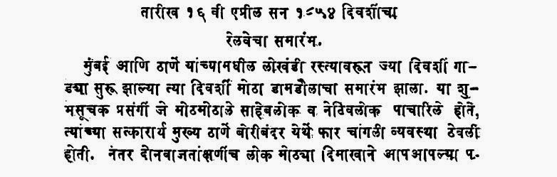 ह्या प्रसंगाचे १८५४ साली छापलेल्या 'लोखंडी रस्त्याचे संक्षिप्त वर्णन', ले. कृष्णशास्त्री भाटवडेकर ह्या पुस्तकातील वर्णन. (त्यातील १६ एप्रिल १८५४ ही तारीख मुद्रणदोषामुळे पडलेली दिसते कारण पुढे दिलेले तिकिटाच्या उत्पन्नाचे आकडे १८ एप्रिल १८५३ पासूनचे आहेत.):