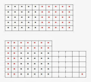 दिलेल्या चौरसाच्या दुप्पट क्षेत्रफळाचा वर्ग कसा काढायचा? दिलेला चौरस शेजारीशेजारी दोन वेळा मांडायचा आणि त्यातील दाणे खालील आकृतीत दाखविल्याप्रमाणे मांडून नवा चौरस मिळतो का हे पाहायचे. आकृतीत ५ इतकी बाजू असलेले दोन चौरस शेजारीशेजारी काढून तेच धान्याचे दाणे वेगळ्या मार्गाने मांडून नवा चौरस मिळतो काय हे पाहण्याचा प्रयत्न केला आहे. असे दिसते की ७ बाजू असलेला नवा चौरस ह्यातून निघतो पण १ दाणा शिल्लक राहतो. हा प्रयोग कोठल्याहि संख्येवर केला तरी सगळे दाणे वापरून नवा चौरस निर्माण करता येत नाही हे लवकरच ध्यानात येते. प्रत्येक वेळी काही दाणे उरतात तरी किंवा कमी पडतात. म्हणजेच केवळ पूर्णांक आणि पूर्ण विभाजन देणारे भागच केवळ वापरून दुप्पट आकाराचा चौरस निर्माण करता येत नाही हे लक्षात येते.